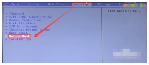 2、跳转至BIOS界面后,使用方向键“→”移动到“Security”界面,再选中SecureBoot项按回车键进入该页面中。