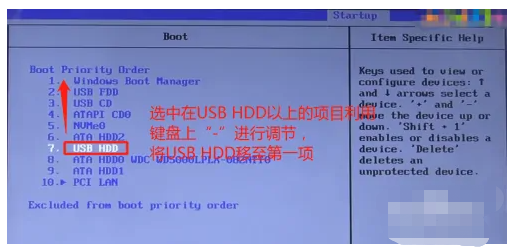 5、选中第七行“USB HDD”项以上的选项,利用键盘上的“-”键将“USB HDD”调整到第一行。