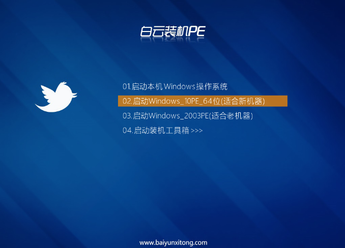 11、白云装机PE下,新电脑按回车选择【02.启动Windows_10PE_64位(适合新机器)】,旧电脑按回车选择【03.启动Windows_2003PE_64位(适合老机器)】;