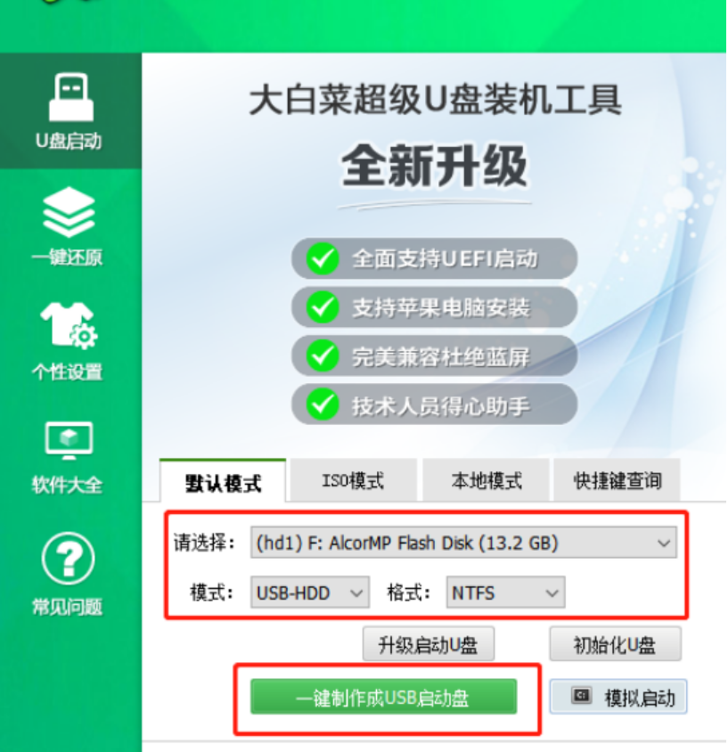 1、下载大白菜U盘启动盘制作工具,插入U盘,打开并点击一键制作。