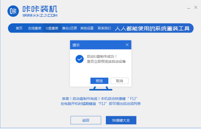 4、耐心等待咔咔装机提示“启动u盘制作成功”即可,这样我们的启动U盘就制作成功啦。