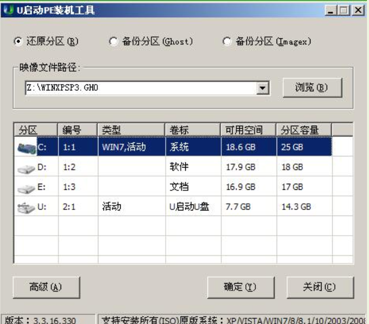 进入pe系统u启动pe装机工具会自动开启并识别u盘中所准备的xp系统镜像,可参照下图的方式进行选择,操作完成后点击“确定”即可: