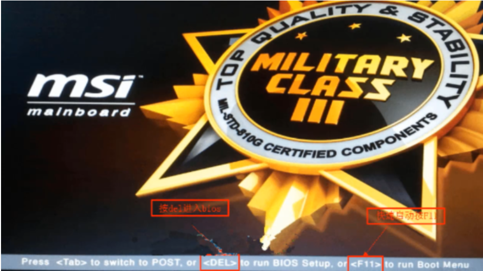 2、当电脑出现微星主板的logo之后,按下del键打开设置页面。