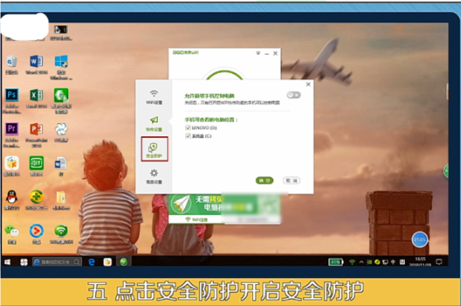 1、双击打开电脑桌面360WIFI,点击安全防护上面的“WiFi图标”。