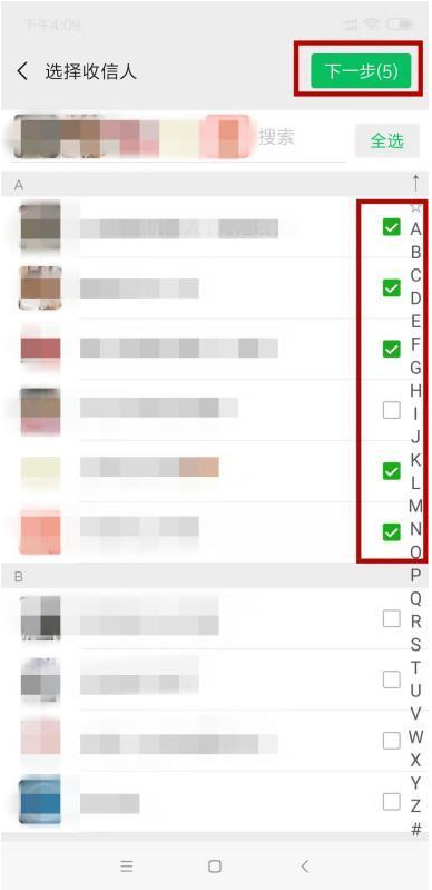 6.进入选择收信人页面,选择你要发的微信联系人。选择下一步
