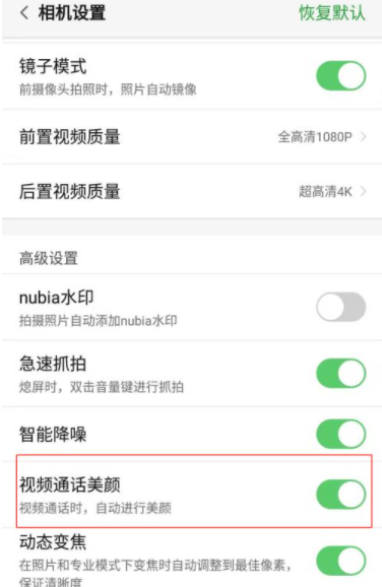 4、找到视频通话美颜一栏,点击后方的开关按钮开启即可。