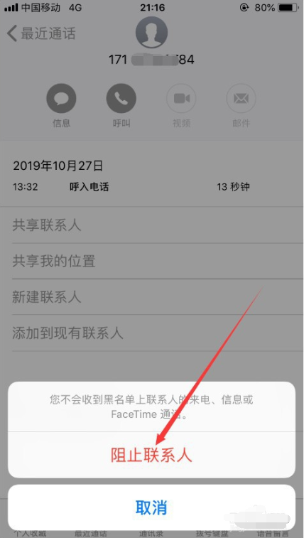 3、这时会弹出二次确认的提示框,选择其中的“阻止联系人”即可拦截该骚扰电话。