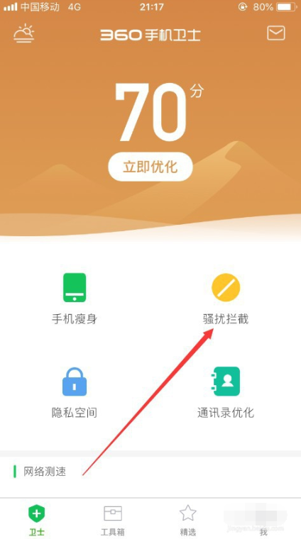 1、手机上的应用中心软件一般都有拦截的功能,这里以360手机卫士软件为例,打开手机上面的这款软件。