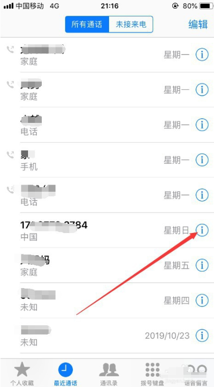 1、打开手机通话,找到骚扰来电的来电号码,然后点击后面的“i”按钮。