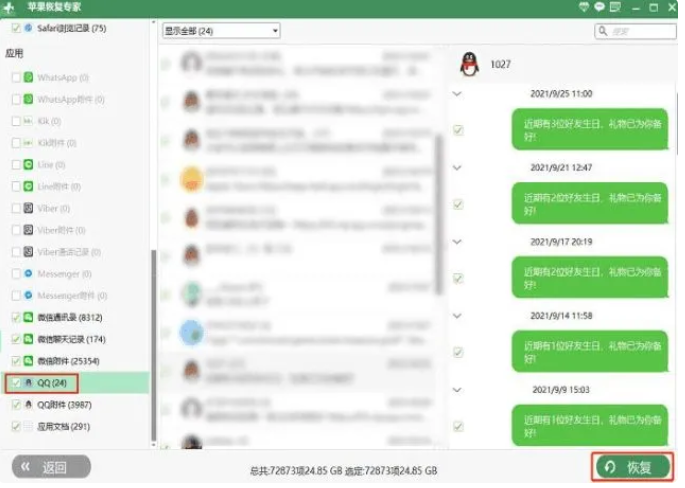 3、可以选择单个好友或者是全部好友来恢复聊天记录,勾选完成后点击【恢复】即可。