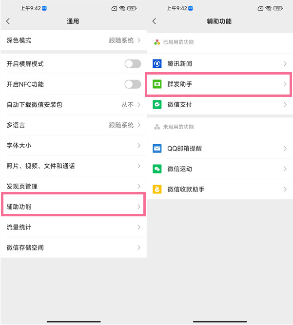 2、然后继续点击【辅助功能】,找到【群发助手】进入。