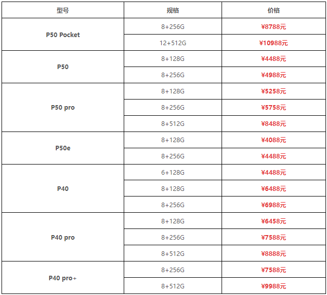华为手机价格大全2022最新