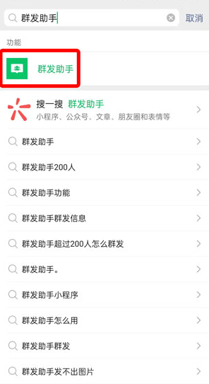 1、打开手机微信,点击上方搜索框,在搜索框中输入“群发助手”。