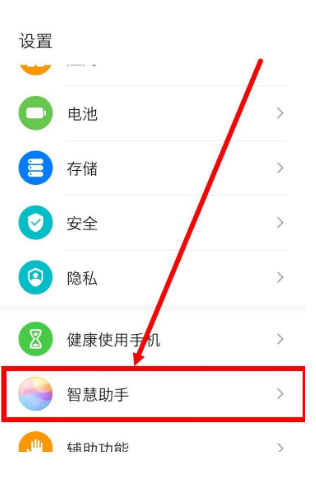 1、打开手机设置,然后在设置列表中选择“智慧助手”。