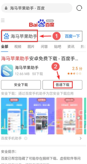 1、首先我们打开百度搜索“海马苹果助手”,点击普通下载即可。