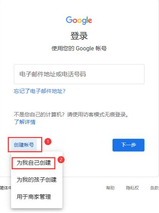 1、首先我们打开谷歌官网或者谷歌gmail邮箱帐号登录入口,选择创建帐号为我自己创建新的谷歌账号或谷歌gmail邮箱帐号即可。