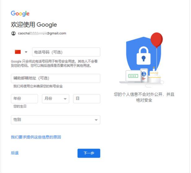 4、验证通过之后,填写google帐号的个人信息下一步完成谷歌帐号注册或者谷歌gmail邮箱帐号注册。