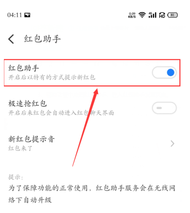 4、在红色信封助手设置界面中,点击以打开红色信封助手以完成微信红色信封提醒。