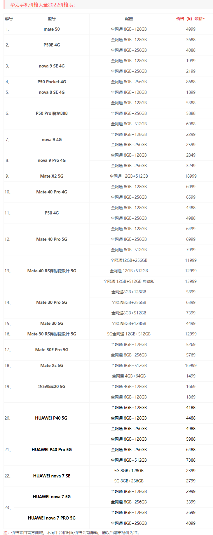 一、华为手机价格大全2022最新价格一览表