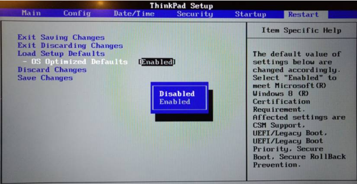 2、选择 Restart,将 OS Optimized Defaults 选项设置为 Disabled(默认为 Enabled);
