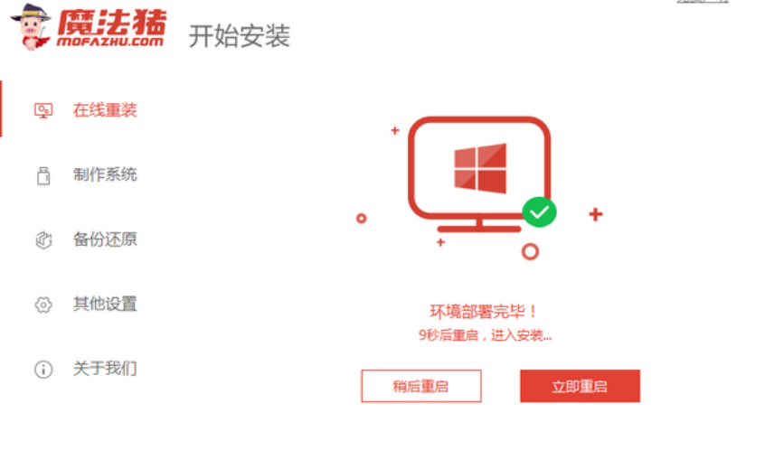3、当提示部署环境完成后,直接选择重启电脑。