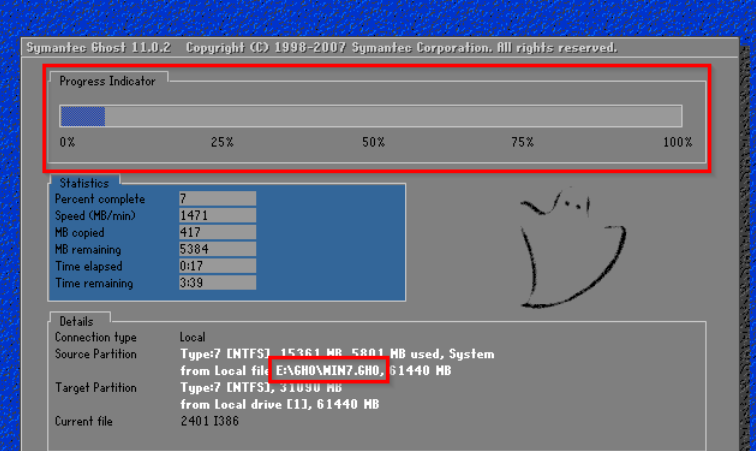 5、这时电脑就会自动重启,进入ghost系统环境,我们可以通过进度条看到系统还原的进度。