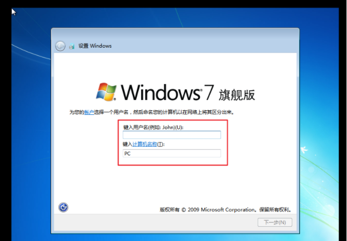 17、安装完成之后,出现下面画面,输入用户名和计算机名,自己随便写,然后点击下一步。