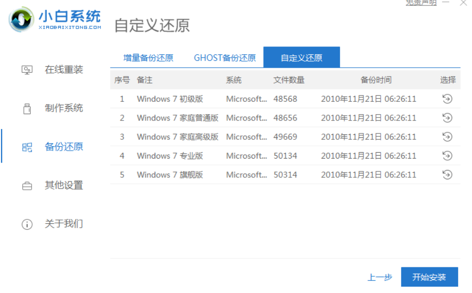 1、下载并打开小白系统软件,点击备份还原——自定义还原,小白会识别出系统文件,识别出来后点击下一步。