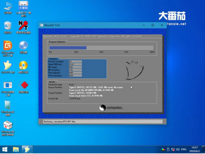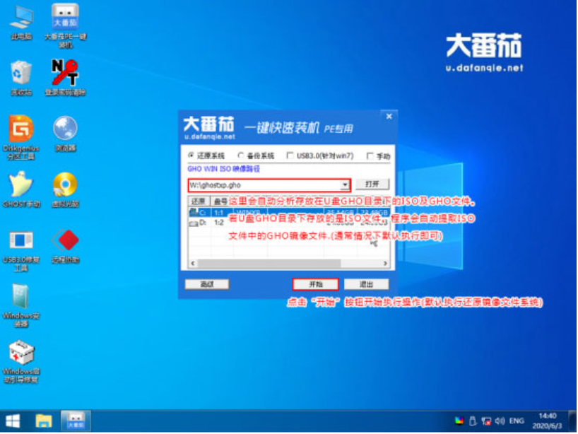 3、进入大番茄Win10PE维护系统后,找到“大番茄PE一键装机”,手动双击开始运行该软件,如下图: