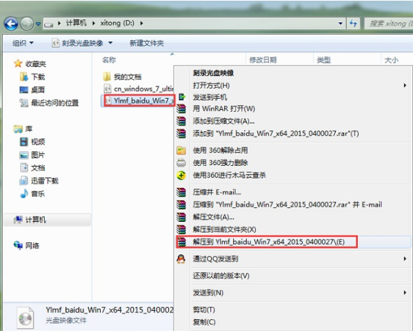 1、右键点击下载好的win7系统iso镜像文件,在弹出的右键菜单栏选择“解压到Ylmf_baidu_Win7_x64_2015_0400027”,然后系统文件就会解压到当前系统镜像所在盘内。