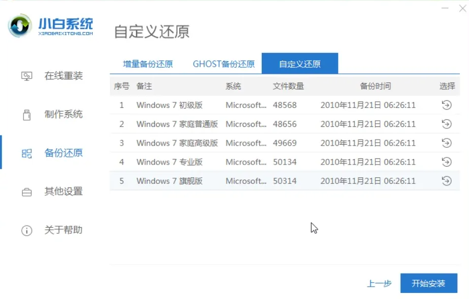 3、选择【备份还原】后再选择【自定义还原】,点击下一步。