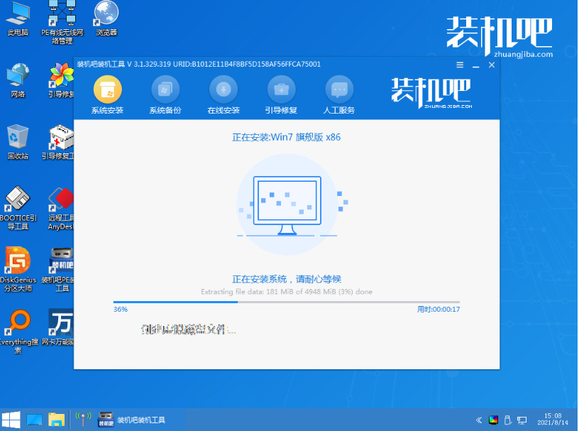 5、在pe系统内打开装机吧装机工具,选择win7系统点击安装到系统盘c盘。