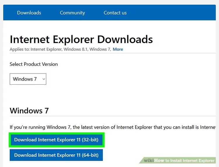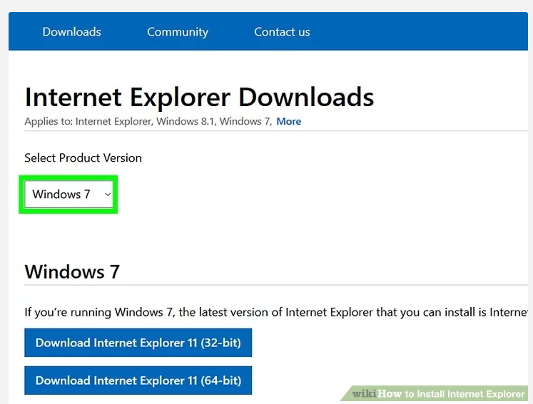 1、打开Internet Explore官网,在“选择产品版本”菜单中选择Windows 7 。