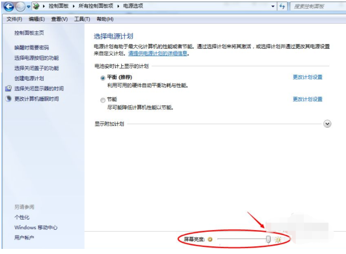 4、在打开的电源选项窗口的最下方可以看到屏幕亮度调整的滚动条,我们直接拖动这里的滚动条就可以更改屏幕的亮度啦。