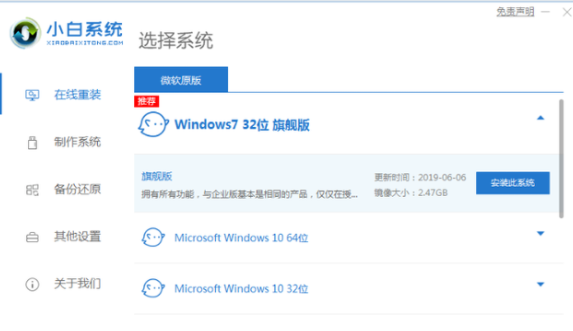1、下载并运行小白一键重装系统,选择我们要安装的win7系统,点击安装此系统。