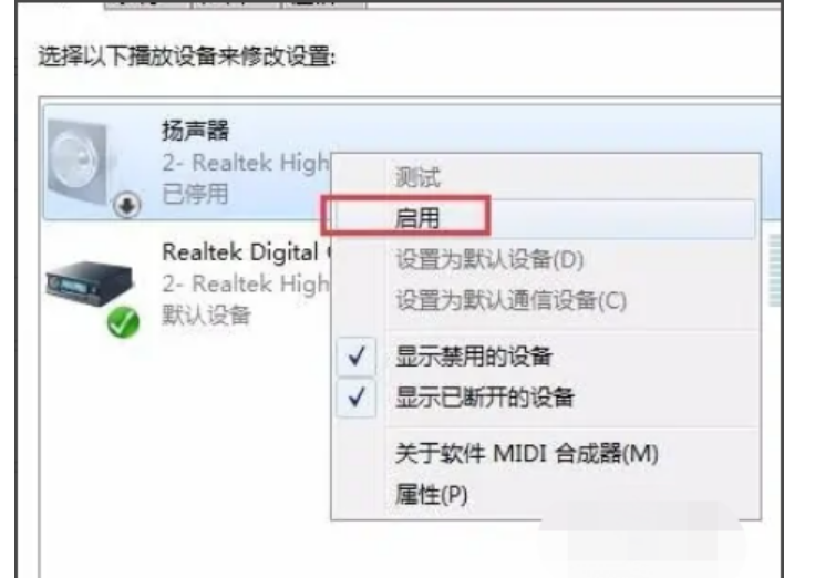 2、选中被禁用的扬声器,右键点击【启用】在确定保存设置。