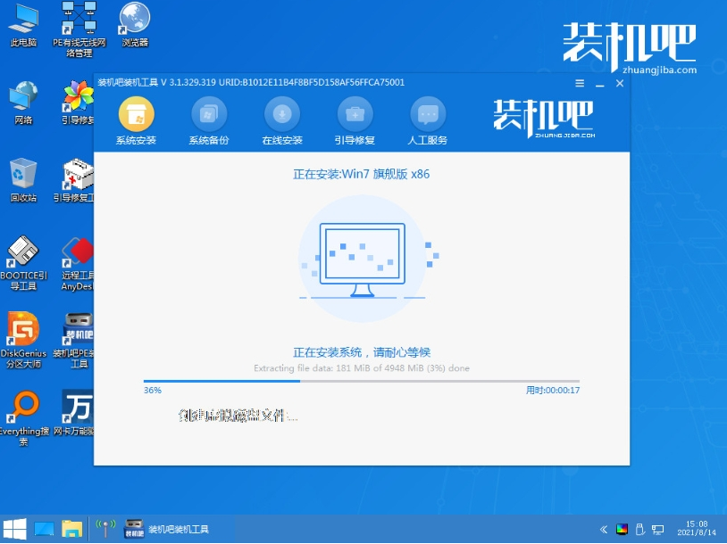5、在pe系统桌面,装机吧装机工具打开并选择win7系统点击安装到系统盘c盘,点击开始安装。