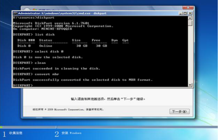 6、输入“convert mbr”命令回车,将硬盘的分模式从GPT模式转换为MBR模式。