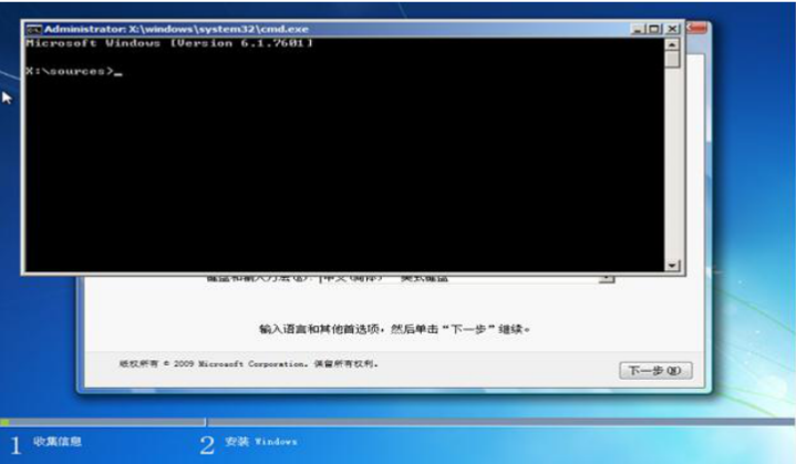 1、在卡住Windows 7系统安装的画面,按下键盘上“Shift”键+“F10”键启动CMD命令行模式窗口。