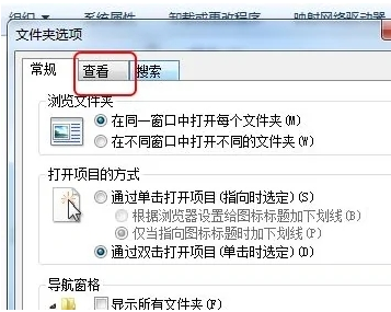 4.打开文件夹和搜索选项页面,接着切换至查看页面;