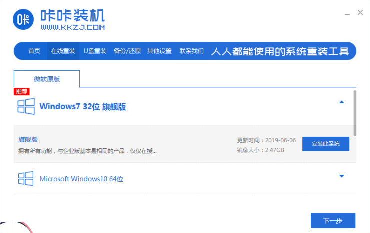 1、下载安装咔咔装机工具并打开,选择需要安装的系统版本,点击下一步。