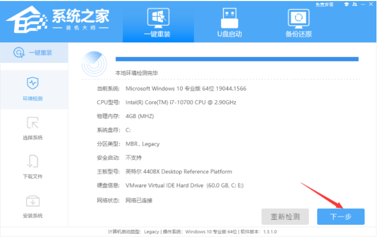1、首先下载安装系统之家装机大师工具并打开,工具将会自动检测当前电脑系统的相关信息,点击下一步。