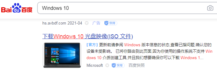 1、百度搜索 Windows 10 系统或者微软 Windows 10,在这里打开微软找到的地址。这里要注意,别下载到广告了哦。