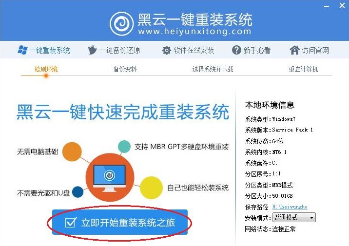 1、我们先去黑云重装系统官网下载安装黑云一键装机,打开后点击立即开始重装系统之旅。