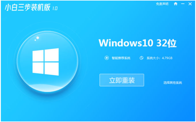 1、回到桌面后,打开小白三步装机,这个重装系统软件,进入到主页面后,选择推荐的系统,再点击右侧的立即重装即可。