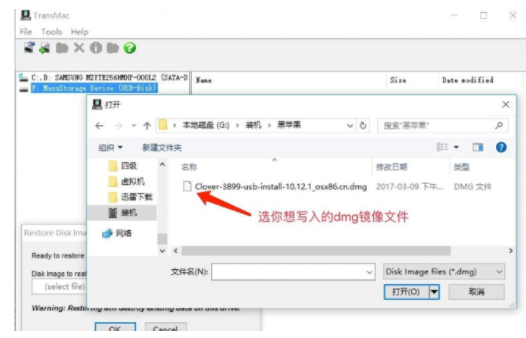2)等待一会儿再点击Restore with Disk Image,选择下载好的mac镜像。然后等待写入完成。