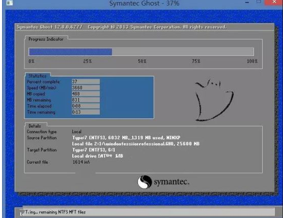 8.系统正在还原中,当进度到100%时,拔掉U盘,系统自动重启。