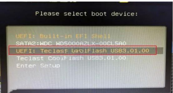 3.在键盘上按上下方向键"↑↓"选择到U盘启动(选项有显示USB或你U盘品牌英文名称),我这里选择"UEFI:Teclast CoolFlash USB3.0",按“Enter”键后电脑进入PE。