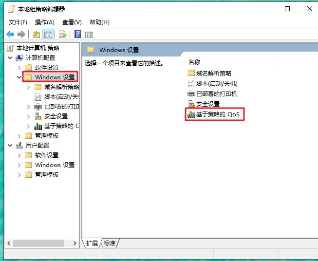 2、本地组策略编辑器打开后,在左侧菜单中点击“windows设置”选项,在对应的右边界面中找到“基于策略的Qos”选项。