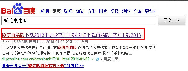 1、打开浏览器,在百度搜索里输入“微信电脑版”,找到如下图所示的搜索结果,点击进入该网站。